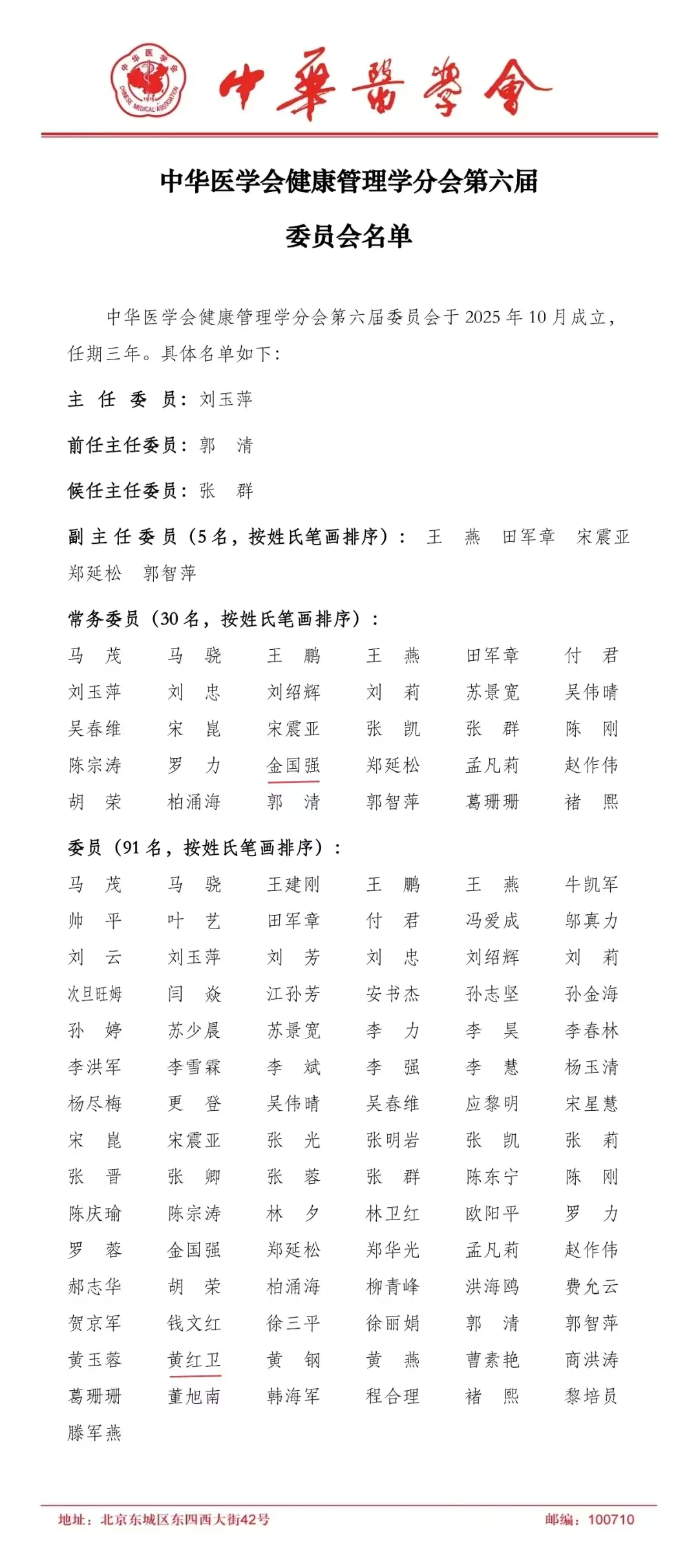 近日,中华医学会健康管理学分会换届选举会议在北京举行。会议汇聚了全国健康管理领域的学术专家,经过严格审议与民主选举,产生了新一届领导机构。江西省医学会健康管理学分会主任委员、南昌大学第一附属医院党委委员、副院长,健康管理医学科学科带头人金国强教授当选为常务委员,江西省医学会健康管理学分会前任主任委员黄红卫当选为委员。此次当选不仅是对金国强教授个人能力和学术地位的认可,更是对我省健康管理学科综合实力的肯定。