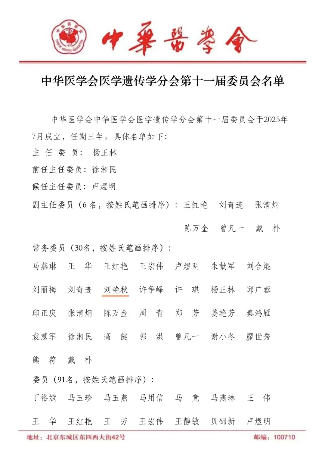 医学遗传学分会主任委员刘艳秋当选中华医学会医学遗传学分会第十一届委员会常务委员